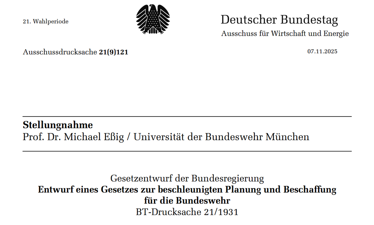 Prof. Dr. Michael Eßig, Leiter des Arbeitsgebiets Beschaffung an der Universität der Bundeswehr München, wurde am 7. November 2025 als Sachverständiger in den Ausschuss für Wirtschaft und Energie des Deutschen Bundestags geladen. Thema der öffentlichen Anhörung war der Entwurf eines Gesetzes zur beschleunigten Planung und Beschaffung für die Bundeswehr (BwPBBG).