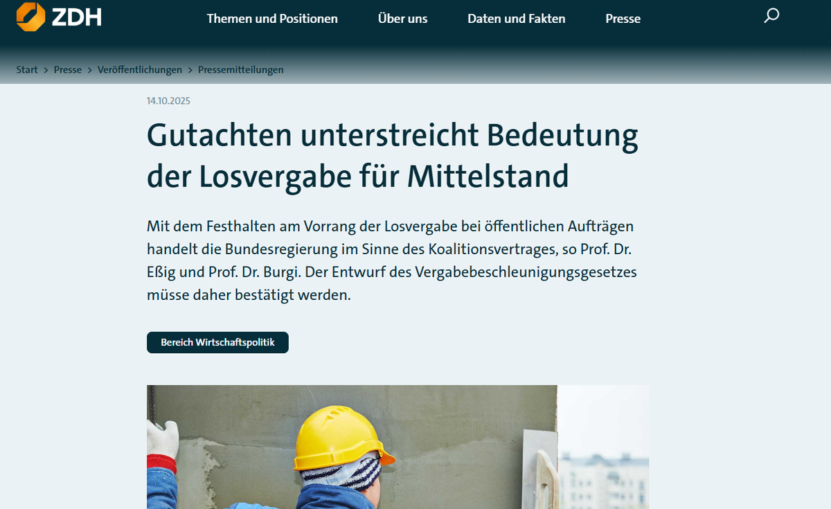 Der ZDH (Zentralverband des Deutschen Handwerks) fordert daher, die mittelstandsfreundliche Ausgestaltung der Vergabe auch im weiteren parlamentarischen Verfahren beizubehalten.