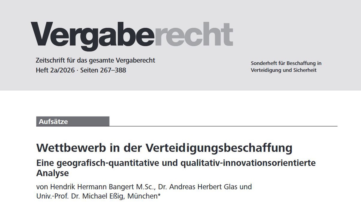 Mit dem Beitrag „Wettbewerb in der Verteidigungsbeschaffung – Eine geografisch-quantitative und qualitativ-innovationsorientierte Analyse“ ist eine neue Publikation des Arbeitsgebiets Beschaffung in der Zeitschrift für das gesamte Vergaberecht (VergabeR) erschienen: