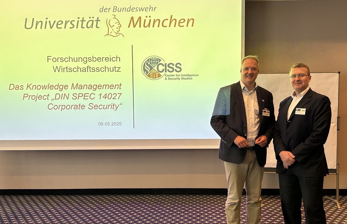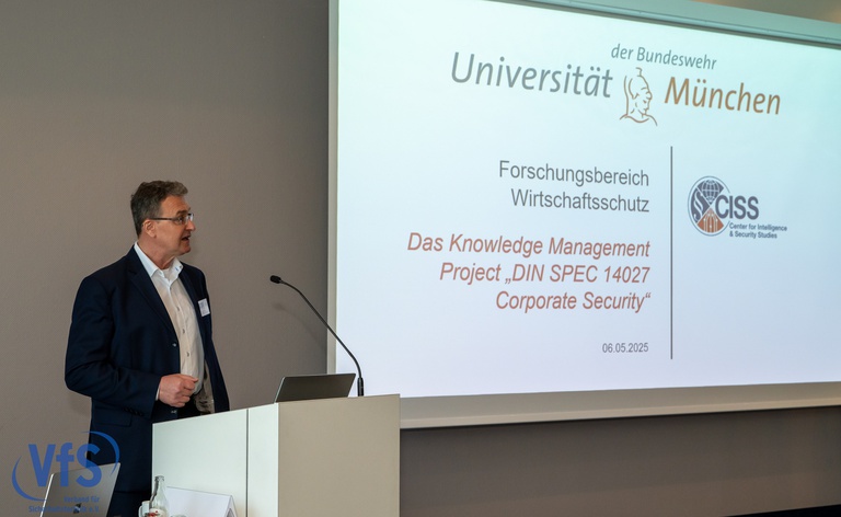 Am 6. Mai 2025 stellte Dr. Jürgen Harrer vom CISS auf dem Kongress des Verbands für Sicherheitstechnik (VfS) e.V. in Leipzig das Projekt "DIN SPEC 14027" aus Sicht des Knowledge Management vor. Bei der DIN SPEC 14027 „Corporate Security - Anforderungen zur Stärkung physischer Resilienz von Organisationen“ handelt es sich um ein vom BMI initiiertes Vorhaben zur Erarbeitung eines fachlichen Standards ("Corporate Security Grundschutz") für die Unternehmenssicherheit.