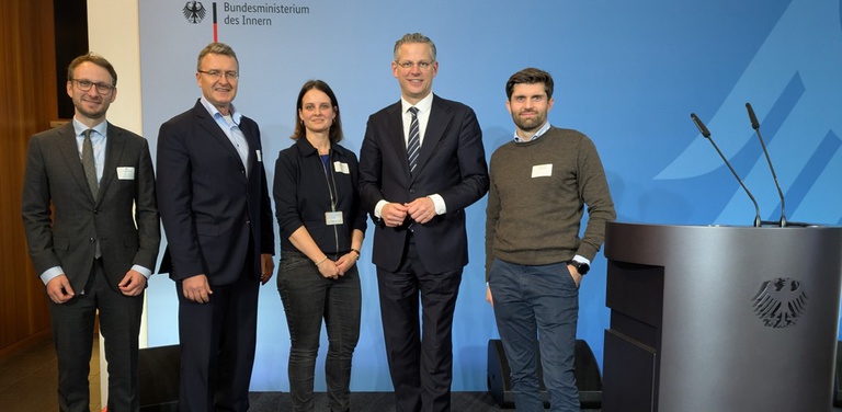 (v.l.n.r.: Lennart Moest (BMI), Dr. Jürgen Harrer (CISS), Ramona Gierok (BMI), PSt Christoph de Vries (BMI), David Huber (Schwarz-Gruppe))