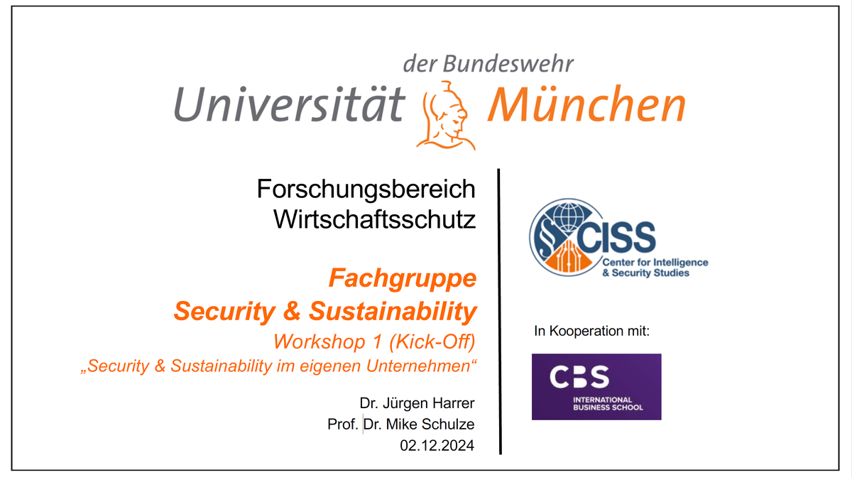 Die Fachgruppe "Security & Sustainability" ist ein Arbeitsformat des Forschungsbereichs Wirtschaftsschutz am CISS, in dem sich Sicherheitsexpert*innen aus international tätigen Unternehmen verschiedener Branchen mit dem Zusammenhang der Themen "Security" und "Sustainability" befassen, künftige Entwicklungen im Bereich Nachhaltigkeit diskutieren und wechselseitig Erfahrungen austauschen. Die Fachgruppe wird von Dr. Jürgen Harrer vom CISS koordiniert, welcher Prof. Dr. Mike Schulze von der CBS International Business School als Forschungspartner für dieses Projekt gewinnen konnte.