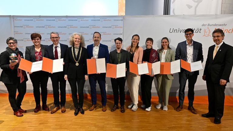 F.l.t.r.: Vice President Prof. Isabelle Deflers, Ulrike Nussel, Prof. Michael Eßig, President Prof. Eva-Maria Kern, Prof. Andreas Knopp, Dr. Franz Krämer, Dr. Caroline Treib, Dr. Kirsty Campbell, Dr. Hannah Ulrich, Dr. Alexander Pauli und Vice President Prof. Geralt Siebert (© UniBw M / Schunk)