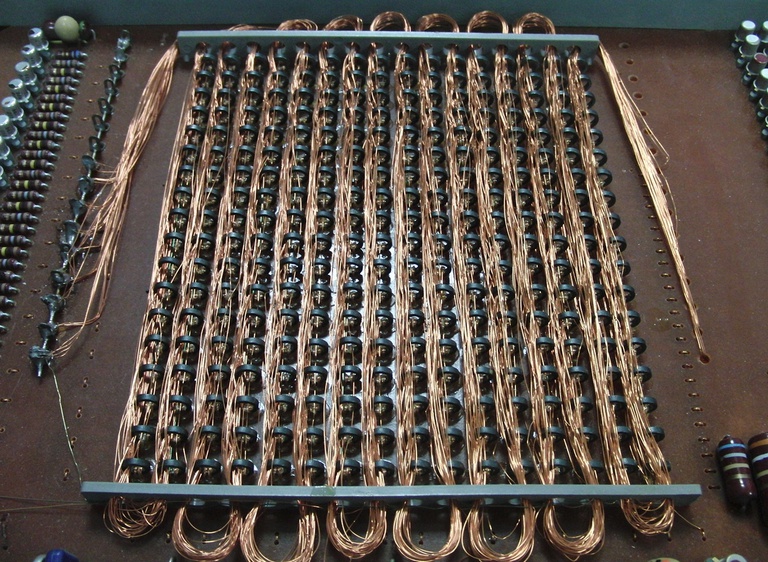 Core rope memory oder Fädelspeicher als ROM (Read-only memory). Das korrekte Fädeln der Drähte durch die Magnetkerne erforderte höchste Konzentration und Geschick. Bei Fehlern musste das Programm mit hohem Zeitaufwand neu gestrickt werden.