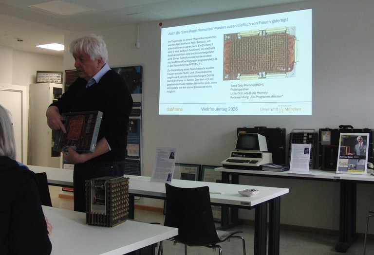 Zum Weltfrauentag 2026 hielt Eberhard Pfeiffer, Initiator und ehemaliger Leiter des bereits in den Anfangsjahren der UniBw M gegründeten Labors für Ingenieurinformatik und nun ehrenmtlicher Unterstützer der datArena, einen Vortrag mit dem Titel Die Rolle von Frauen in der Entwicklung der Computertechnik und der Computerwissenschaften. Zu den Themen zählten die intellektuellen und handwerklichen Leistungen von Frauen sowie die gesellschaftlichen Rahmenbedingungen, die jeweiligen Rollenbilder und die persönlichen Lebensumstände.