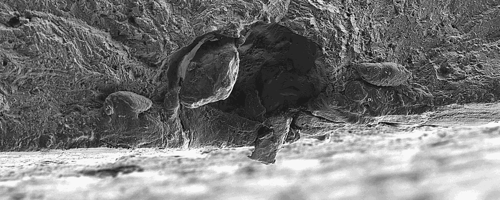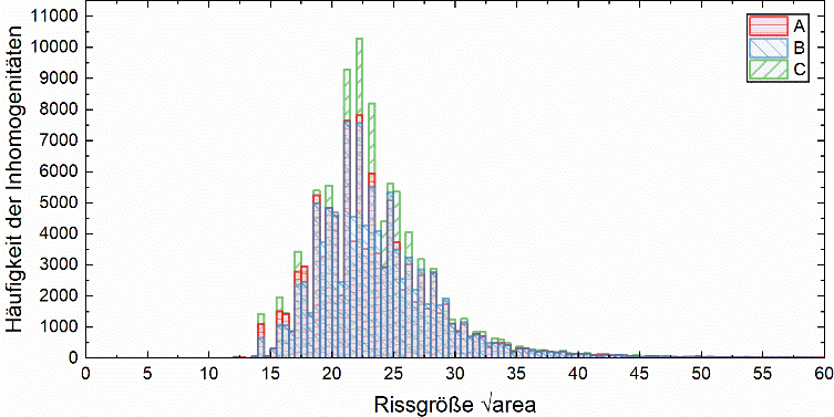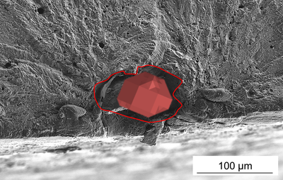 Die bruchauslösenden Inhomogenitäten konnten in computertomografischen (CT) Scandaten identifiziert und mittels numerischer Analyse hinsichtlich des Anteils der Rissinitiierungs- und Rissausbreitungsphase an der Gesamtlebensdauer des Bauteils eingeordnet werden. Die anschließende Ermüdungsbelastung und Auswertung der Bruchfläche mittels REM ermöglicht die Identifikation der bruchauslösenden Inhomogenität im CT-Scandatensatz. Hierbei wurde deutlich, dass die ursprüngliche (CT) Inhomogenität sich mit Belastung deutlich verformt, wobei sich ggf. auch aufeinanderliegende Flanken von Poren geöffnet haben. Daher ist die in der Bruchfläche erkennbare Inhomogenität deutlich größer als aus der CT-Messung vermutet wurde (Abbildung 2, rechts). Die Häufigkeitsverteilung der prozessinduzierten Inhomogenitäten zeigt dabei, dass nicht die größte Inhomogenitäten zum Versagen führen, wenn sich diese im Bauteilvolumen befinden (Abbildung 2, links). Demnach geht von Inhomogenitäten, welche sich am Bauteilrand bzw. in dessen unmittelbaren Umgebung befinden, trotz deutlich kleinerer Größe ein Ermüdungsversagen aus.
