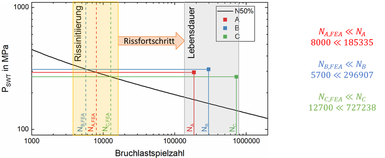 Abbildung 3: Vergleich der Schädigungsparameter nach Smith, Watson und Topper laut Experiment (durchgezogene Linien) und FEA (gestrichelte Linien) der Ermüdungsproben A, B und C. Es wird deutlich, dass die Rissausbreitung einen signifikant größeren Einfluss auf die Bauteillebensdauer einnimmt als die Rissinitiierungsphase.