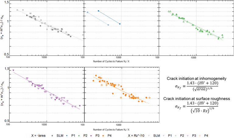 Neben den Inhomogenitäten wirken sich weiterhin die prozessbedingte Oberflächenrauheit und Eigenspannung direkt auf die Ermüdungsfestigkeit aus. Hierfür wurden die Auswirkungen von Wärmebehandlung [4] sowie von Konturdruckparametern experimentell untersucht. Um den Einfluss von Eigenspannungen auf die tatsächliche Spannungsamplitude zu berechnen, wurde ein mittlerer Spannungssensitivitätsfaktor definiert. Teile, die mit verschiedenen Druckparameter-Sätzen hergestellt wurden, zeigten vergleichbare Eigenspannungen . Zur Vorhersage der Zeitfestigkeit von PBF-LB/M/AlSi10Mg wurde eine Korrektur der Spannungsamplitude zu bestimmt. Durch Berücksichtigung der risseinleitenden Inhomogenität als Teil der Porosität nach Shiozawa wurde die Streuung der S-N-Kurven reduziert. Eine Modifikation von Shiozawas Ansatz, wobei die rissinitiierende Größe durch die Oberflächenrauheit mit dem Faktor ersetzt wird und die Korrektur der Spannungsamplitude mit den Eigenspannungen, zeigt eine vielversprechende Methode zur Vorhersage der Ermüdungslebensdauer auf Basis der Rissinitiierung (Abbildung 4). Im Vergleich zu Shiozawa ist eine Vorhersage vor dem Testen möglich und daher ohne Untersuchung der getesteten Rissflächen [8].