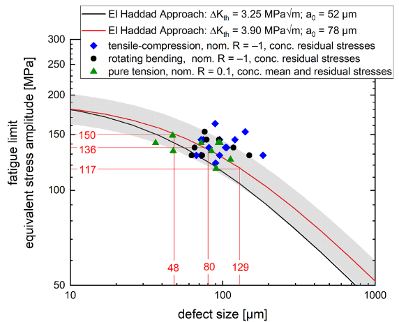 Um eine Lebensdauer auf Basis des Rissfortschritts sowie statistischer Inhomogenitätsverteilung zu ermitteln, wurden weiterhin Wöhlerkurven von gedrehten Ermüdungsproben bei unterschiedlichen Lastverhältnissen und Belastungsarten untersucht. Für die Beurteilung wurde das Kitagawa-Takahashi-Diagramm mit einem Rissfortschrittsverhalten nach Literatur verwendet. Zur Beschreibung des Übergangs zwischen ausbreitungsfähigen und nicht-ausbreitungsfähigen Inhomogenitäten wurde der Ansatz nach El Haddad gewählt. Die Untersuchungen zeigten, dass einfache Risswachstums- und Rissschließungsmodelle den Einfluss der prozessbedingt Eingebrachten Inhomogenitäten hinreichend beschreiben können (Abbildung 5). Demnach ist es möglich, die Lebensdauer und die Dauerfestigkeit vorherzusagen, wenn die Verteilung der Inhomogenitätsgröße und die global vorherrschenden Eigenspannungen bekannt sind [9].