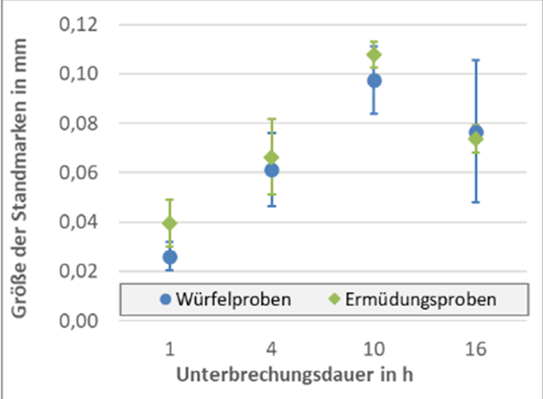 Untersucht wurden die Geometrie der Standmarken (Abbildung 2), ob eine erhöhte Porenbildung oder Veränderungen im Gefüge auftreten sowie die Festigkeit bei statischer und dynamischer Beanspruchung. Während eine Korrelation zwischen der Größe der Standmarke und der Unterbrechungsdauer zu erkennen ist, konnte bei den untersuchten Probekörpern trotz deutlicher Größenunterschiede keine Abhängigkeit von der Probengröße festgestellt werden (Abbildung 2c). Darüber hinaus deuten die bisherigen Ergebnisse an, dass der Schichtversatz nicht permanent ist und sich dieser wieder ausgleicht, sobald die Fertigungsanlage ihre übliche Betriebstemperatur erreicht hat (Abbildung 2d).