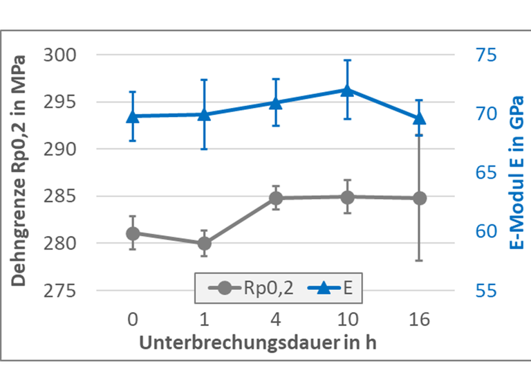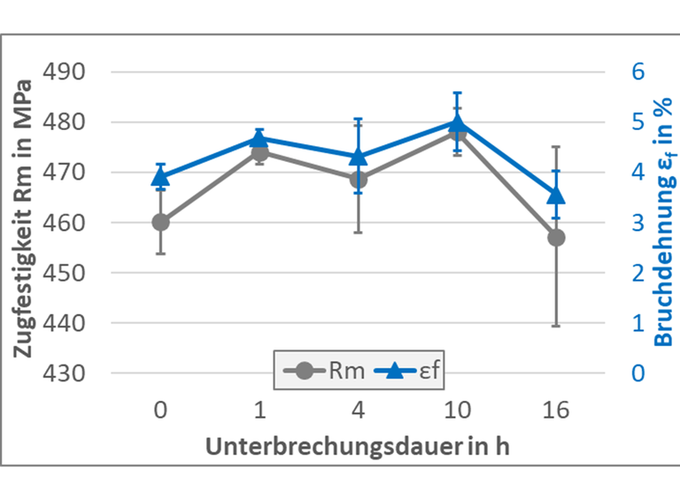 Bei längeren Unterbrechungsdauern wurde ein deutlicher Anstieg der Porosität in der Unterbrechungsebene festgestellt. Die Mikrostruktur und die Härte blieben hingegen weitestgehend unverändert. Für die Zugversuche wurden gedrehte Proben verwendet, welche keine Standmarke mehr aufweisen. Die Ergebnisse zeigen, dass ab einer Unterbrechungsdauer von 16 Stunden die Streuung der Zugfestigkeit (Rm) sowie der Dehngrenze (Rp0,2) deutlich ansteigen (Abbildung 3a und b). Das ist ein Indiz für vermehrte Fehlstellenbildung und reduziert die Prozessfähigkeit erheblich. Dies wird bei Betrachtung der Bruchflächen bestätigt, bei denen die unterbrochenen Proben deutlich mehr nicht vollständig aufgeschmolzene Bereiche vorweisen als die Referenzproben (Abbildung 3c und d). Mit steigender Unterbrechungsdauer versagen zudem mehr Proben im Unterbrechungsbereich, was die negativen Auswirkungen untermauert.