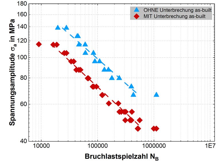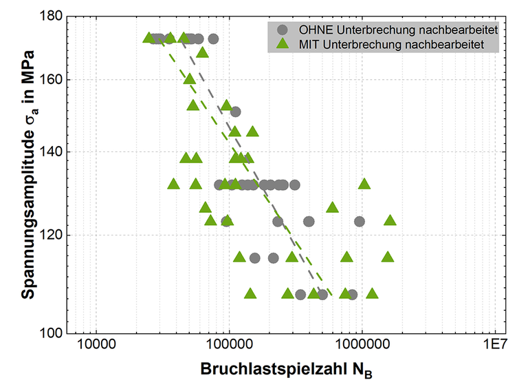 Anhand der Ermüdungsversuche ist die schädliche Wirkung der Standmarken deutlich erkennbar (Abbildung 4). Während bei den nicht nachbearbeiteten Proben, welche die Standmarke noch aufweisen (Abbildung 4a) ein signifikanter Abfall der Ermüdungsfestigkeit zu erkennen ist, zeigen die spanend nachbearbeiteten Proben mit und ohne Unterbrechung annähernd gleiche Eigenschaften (Abbildung 4b).