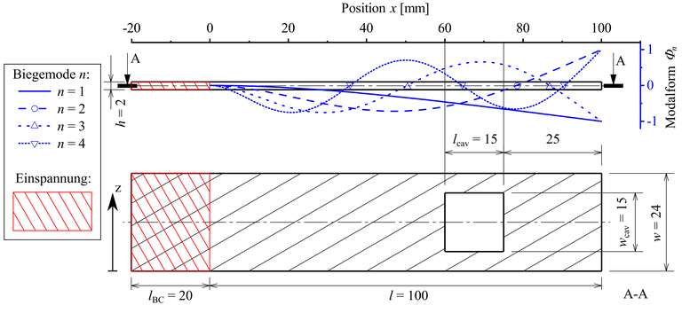 Es wurden zwei Arten von Probekörpern entworfen. Die zwei "massiven" Proben sind vollständig verschmolzen und dienen als Basis für die Modalparameter. Die drei "Kavitäts"-Proben haben die gleiche äußere Geometrie wie die massiven Proben und unterscheiden sich nur durch einen inneren Hohlraum, dessen Position so gewählt wurde, dass er nicht mit einem Knotenpunkt in den ersten drei Biegemoden überlappt. Allerdings fallen ein Knotenpunkt der vierten Biegemode und der Hohlraum überein. Die Dimensionen der Probekörper und die ersten vier Biegemoden können in Abb. 2 gesehen werden.