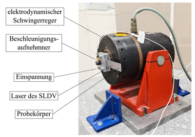 Versuchsaufbau des elektrodynamischen Schwingerregers mit einer Probe in der Einspannung, dem Beschleunigungsmesser zur Messung der Systemanregung und dem Laserpunkt des SLDV zur Messung der Systemantwort [14]