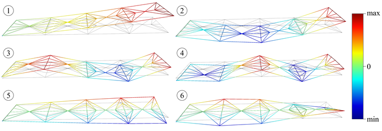 Qualitativer Vergleich zwischen den Verschiebungen der ersten sechs Schwingungsformen; (1) - (4) zeigen die ersten vier Biegemoden und (5) & (6) zeigen die ersten beiden Torsionsmoden [14]