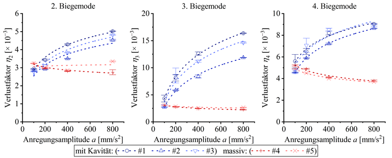 Die Daten der ersten Biegemode werden nicht berücksichtigt, da große Auslenkungen zu parasitärer Reibung in der Einspannung führt, die die Bauteildämpfung beeinflusst [13]. Der Vergleich der Dämpfung als Verlustfaktoren aller Proben für alle betrachteten Biegemoden ist in Abb. 5 zu sehen. Die Biegemoden zeigen für die kleineren Anregungsamplituden wenig bis keine Dämpfungswirkung. Bei höheren Anregungsamplituden nimmt die Dämpfungswirkung allerdings stark zu. Ein positiver Dämpfungseffekt ist für alle Biegemoden zu erkennen, am deutlichsten jedoch für die dritte Biegemode. Die Dämpfung der Torsionsmoden wurde ebenfalls analysiert, aber es wurde kein signifikanter Dämpfungseffekt gemessen.
