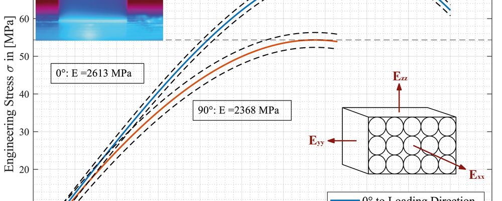 Der FFF-Fertigungsprozess resultiert typischer Weise in anisotropen und „schlechteren“ mechanischen Eigenschaften als denen spritzgegossener Teile aus identischem Material. Die Ursache für dieses Verhalten ist auf die Prozessinduzierte Mikrostruktur zurück zu führen. So sind die individuellen Polymerstränge im Bauteil eindeutig zu erkennen. Dies geht mit regelmäßig orientierten Hohlräumen einher, welche die Gesamtsteifigkeit des Materials reduzieren. Darüber hinaus bilden sich in den Kontaktbereichen, den sogenannten Interfaces, zwischen den einzelnen Polymersträngen mechanische Eigenschaften aus, welche sich signifikant von denen des Basismaterials unterscheiden. Darüber hinaus hängt die Ausprägung der Interface-Eigenschaften massgeblich von den Temperaturgeschichte während des Druckprozesses ab.