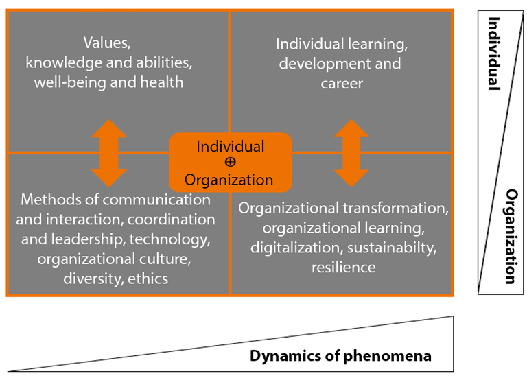 Areas of interest include aspects that characterize the individual within the organization, such as their knowledge and abilities, as well as organizational-level phenomena, such as organizational culture, practices of communication or technologies and resilience of organizations. Developments at the individual and organizational level are also examined from a dynamic perspective, however.