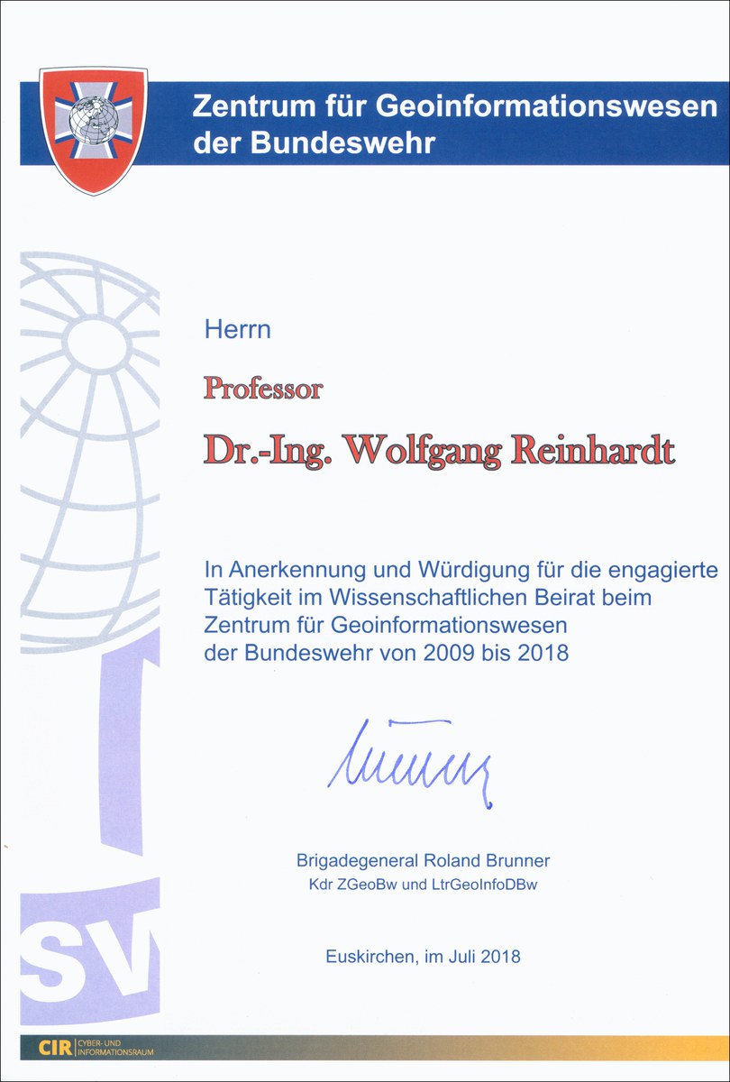 Am 25. Juli 2018 wurde Prof. Dr.-Ing. Wolfgang Reinhardt nach neunjähriger Mitgliedschaft aus dem Wissenschaftlichen Beirat beim Zentrum für Geoinformationswesen der Bundeswehr verabschiedet. Über drei Perioden mit jeweils drei Jahren gehörte er von 2009 bis 2018 diesem Gremium an; in den beiden ersten Perioden als stellvertretender Vorsitzender und in der letzten Periode als Vorsitzender des Beirates. In Anerkennung und Würdigung seiner engagierten Tätigkeit wurde ihm durch den Kommandeur des Zentrums für Geoinformationswesen der Bundeswehr (ZGeoBw) und Leiters des Geoinformationsdienstes der Bundeswehr (GeoInfoDBW) Brigadegeneral Roland Brunner eine Urkunde überreicht.