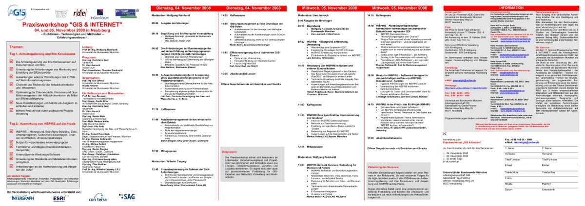 - Erfahrungsberichte innovativer Anwender, Präsentation von hilfreichen Werkzeugen führender Hersteller auf dem GIS Marktplatz, Erfahrungsaustausch mit betroffenen Kollegen