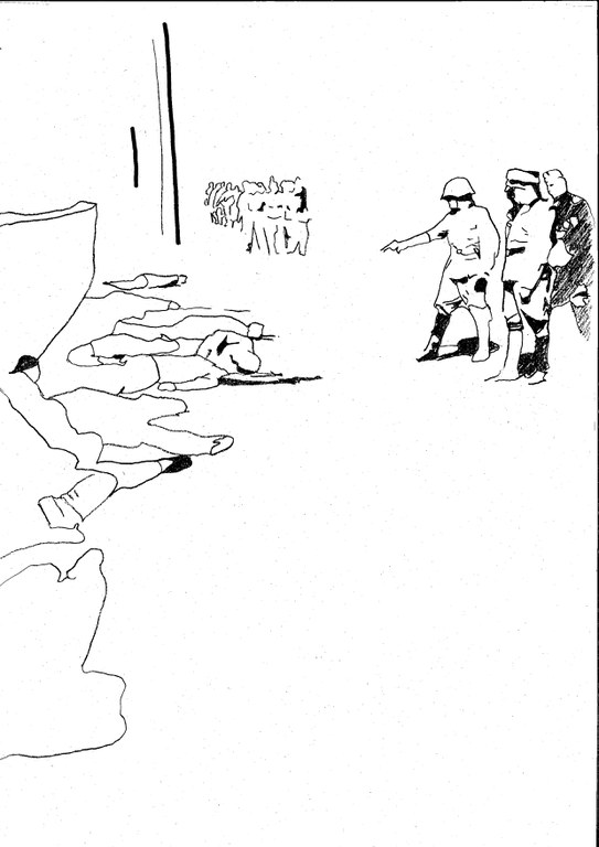 Bildquelle: Zeichnung, nach einer Fotografie von Gerhard Gronefeld (Geisel-Hinrichtung in Pancevo durch Waffen-SS und Wehrmacht. Pancevo, Serbien (ehem. Jugoslawien), 22.04.1941. Berlin, Deutsches Historisches Museum, Nr. GG 388/16. © bpk / Deutsches Historisches Museum / Gerhard Gronefeld).