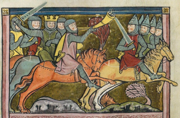Bildquelle: Ausschnitt einer Schlachtszene des Kamps um Tortosa aus des durch den Stricker bearbeiteten Rolandsliedes. St. Gallen, Kantonsbibliothek, Vadianische Sammlung, VadSlg Ms. 302, fol. fol. II 6v, unter CC BY-NC 4.0-Lizenz.