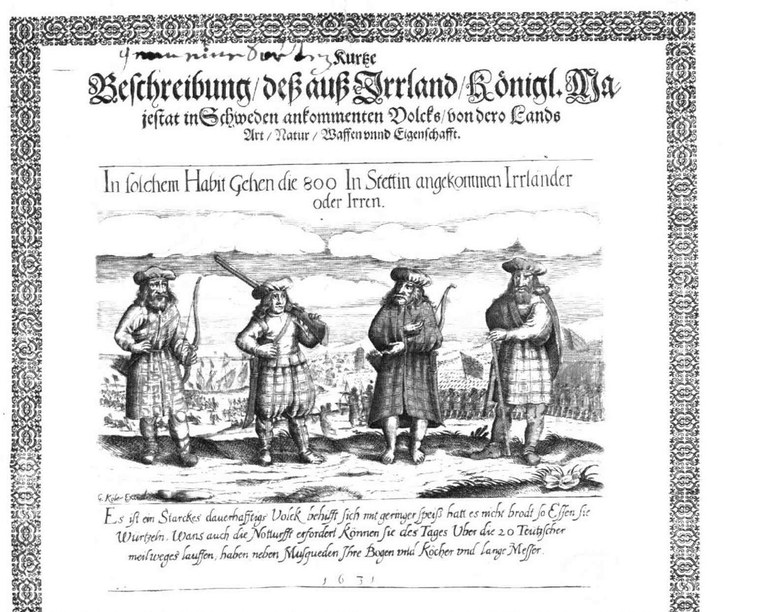 Bildquelle: Four "Irish" soldiers in kilts with battle scene in the background. 800 Scottish troops arrived to battle in Stettin on the side of Swedish troops in 1631. (Paas, J.R.: Deutsche Flugblätter, 1600-1700, Vol. 5, S.1321)
