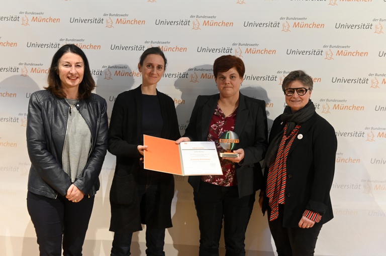 Ulrike Nussel (2.v.r.) nahm die Preis stellvertretend für die beiden Workshopleitungen entgegen. Beiratsvorsitzende Pamela Koch, Beiratssprecherin Prof. Julia Reif (v.l.n.r.) und Vizepräsidentin Prof. Deflers (r.) gratulierten herzlich. (Foto: Claus Schunk)
