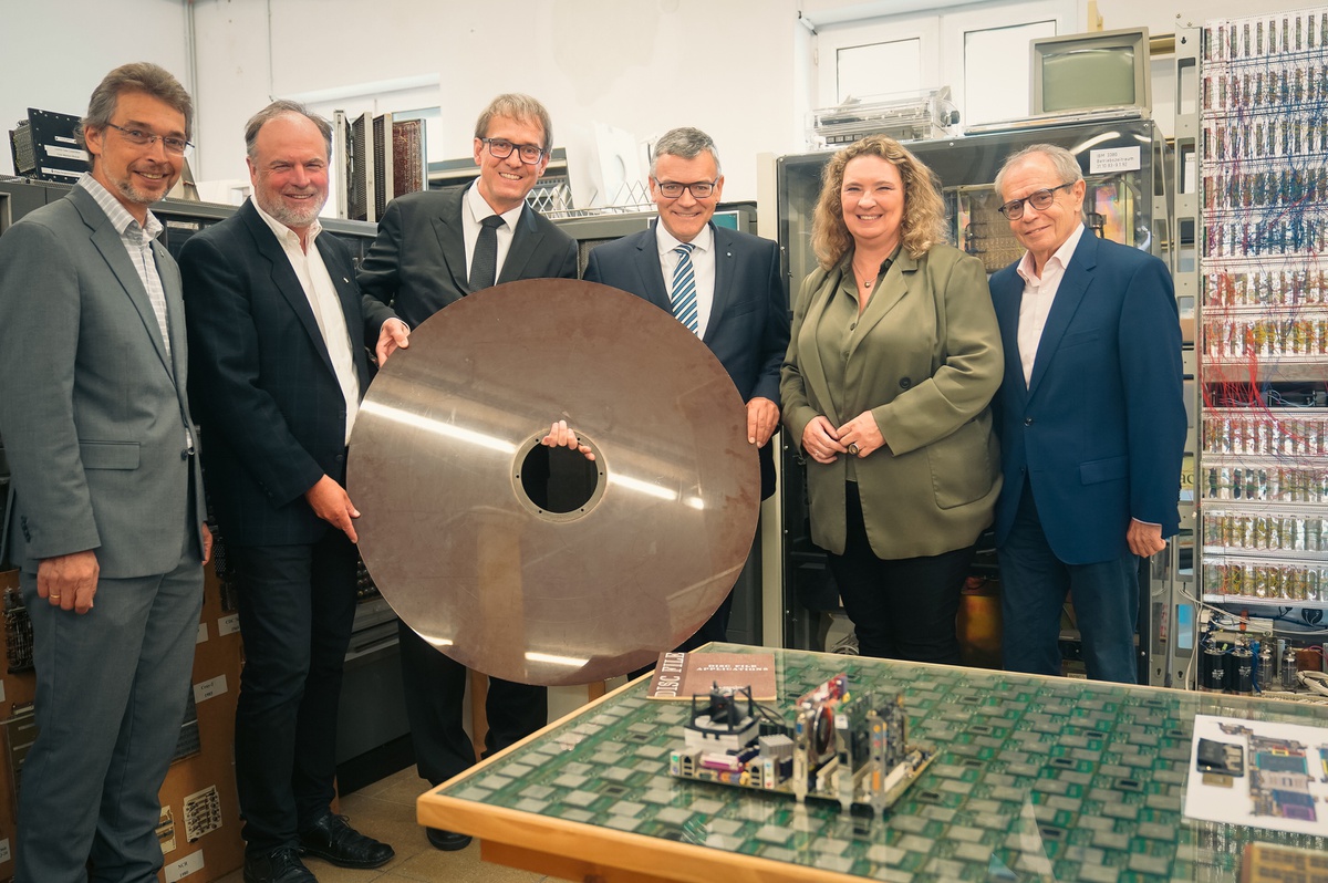Bei ihrem Besuch in der datArena der Universität der Bundeswehr München am 15. September 2025 machten der Leiter der Staatskanzlei Dr. Florian Herrmann und die Landtagsabgeordnete Kerstin Schreyer einen Gang durch die Geschichte der Informationstechnologie und ließen sich von der Hollerithmaschine bis zu den Vektorprozessoren die vielen interessanten Sammlungsstücke zeigen.