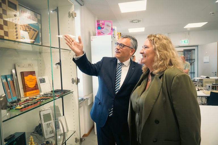 Dr. Florian Herrmann und Kerstin Schreyer bewundern historische Ausstellungsstücke in der datArena der Universität der Bundeswehr München (© Universität der Bundeswehr München/Siebold)