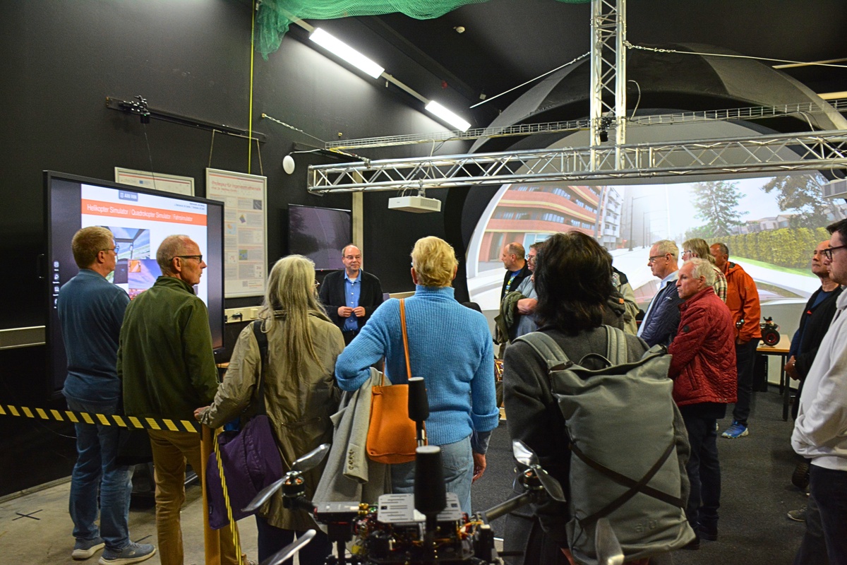 Prof. Gerdts, Inhaber der Professur für Ingenieurmathematik, und seine Mitarbeiter hatten vier Stationen vorbereitet, an denen er mit seinem Team verschiedene Aspekte seiner Forschung aus dem Bereich der optimalen Steuerung und Regelung vorstellte. An der ersten Station, einem Fahrsimulator, konnten die Teilnehmenden verschiedene Simulationsszenarien erproben. Ebenso konnten Miniatur-„Crazyflie“-Drohnen über einen PC angesteuert und geflogen werden. Mit diesen wird zum Beispiel die autonome Landung auf sich bewegenden Fahrzeugen untersucht. An einer weiteren Station konnten die Besucherinnen und Besucher in einer Live-Demonstration mit der Echtzeit-Flugbahnplanung mit Hindernisvermeidung experimentieren. Diese KI-gesteuerte Anwendung wurde in Simulationen und realen Flugversuchen mit einem Ultraleichtflugzeug für den Einsatz in unbemannten Systemen entwickelt. Das Highlight war schließlich das autonome Fahrzeug, in dem die Teilnehmenden mitfahren durften. Wie abenteuerlustig sie waren, konnten sie anhand der Geschwindigkeit des Fahrzeugs auf der 2,8 Kilometer langen Strecke selbst entscheiden. Prof. Gerdts und seine Mitarbeiter gaben den Teilnehmenden einen Einblick in die Entwicklung unbemannter Systeme, die Ende der 1980er Jahre mit den Arbeiten von Prof. Dickmanns zum autonomen Fahren an der UniBw M ihren Ursprung hatte.