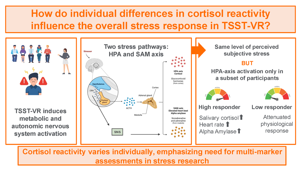 Conclusion: These findings suggest that the TSST-VR can effectively induce measurable stress responses and may provide insights into individual differences in physiological and metabolic stress reactions. The study highlights the potential of virtual stress paradigms in stress research and underscores the advantages of a virtual setting in terms of standardization and economic considerations.