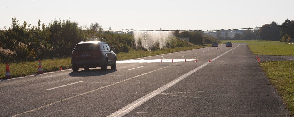 Obstacles that unexpectedly obstruct a vehicle’s path can be simulated with a water curtain suddenly cascading onto the road. Thus, the driver’s startle responses and typical patterns of behavior can be examined. Driving through the water wall poses no danger to either driver or vehicle. If a driver reacts wrongly or too late and fails to swerve around this “obstacle” or stop in front of it, there will thus be no consequences.