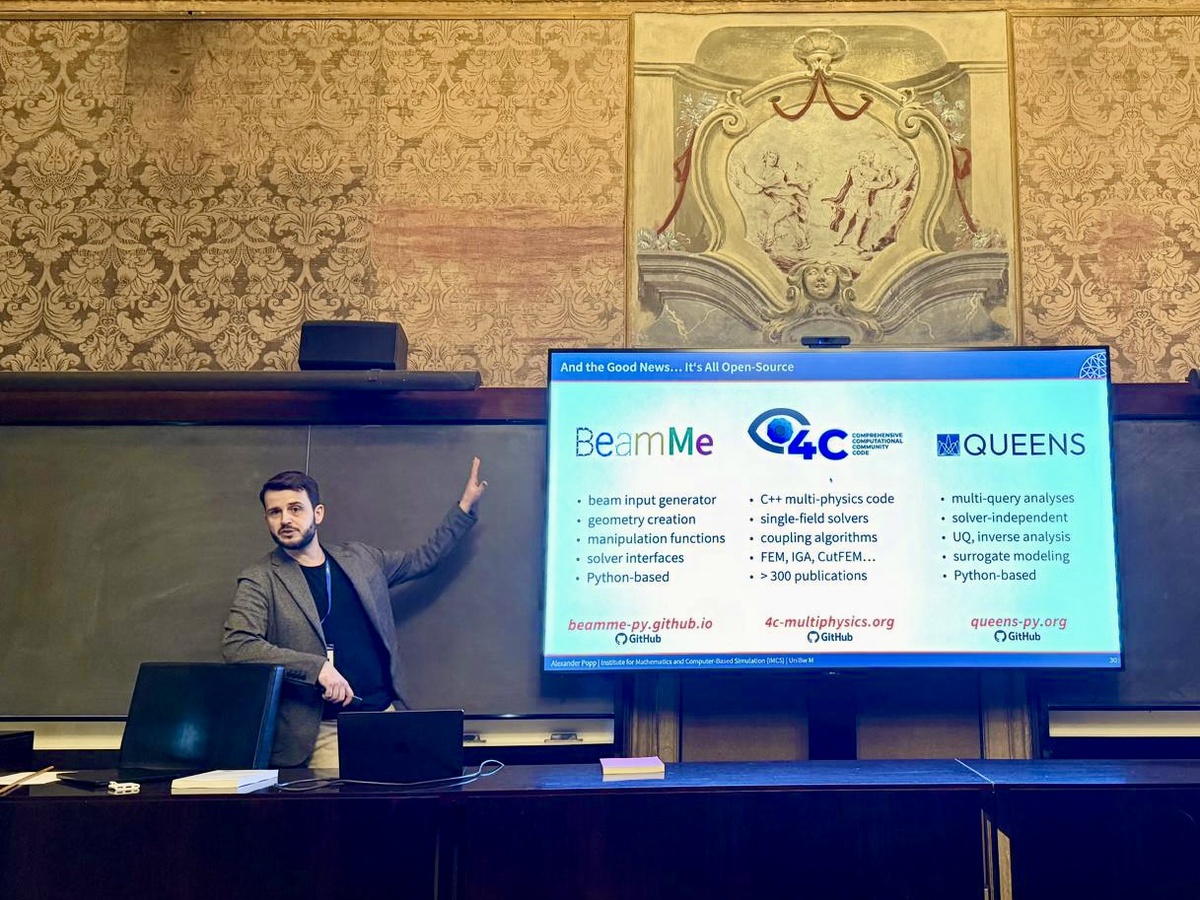From IMCS, Institute Head Alexander Popp served as co-organizer of this edition of the workshop. In addition, Sebastian Brandstaeter participated in the scientific programme. Both contributed presentations showcasing their latest research activities and collaborative efforts with Italian partners: Alexander Popp presented the institute’s work on mixed-dimensional modelling, while Sebastian Brandstaeter spoke about probabilistic analyses in computational mechanics.