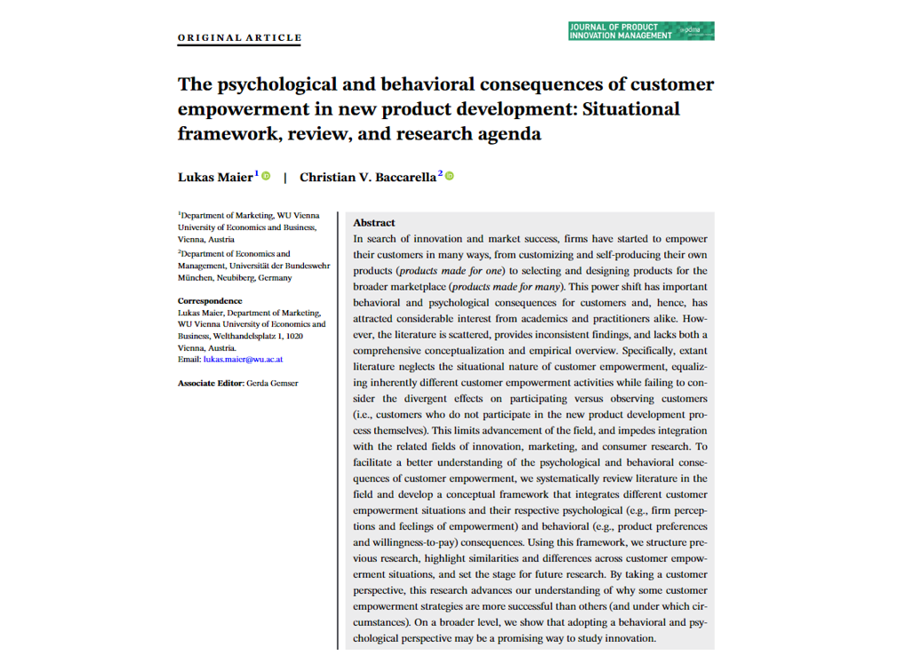 Der Artikel „The psychological and behavioral consequences of customer empowerment in new product development: Situational framework, review, and research agenda“ von Lukas Maier (WU Wien) und Christian Baccarella dreht sich um die verhaltenspsychologische Auswirkungen der Einbindung von Kunden in den Innovationsprozess. Das ist wichtig, da existierende Literatur fragmentiert ist und eine konsistente konzeptionelle Einordnung fehlt, vor allem in Bezug auf spezifische Umstände und situative Charakteristika. Um ein besseres Verständnis über die psychologischen und verhaltensbezogenen Konsequenzen der Kundenermächtigung zu erlangen, führt die vorliegende Arbeit eine systematische Literaturübersicht durch und entwickelt basierend darauf einen geeigneten konzeptionellen Rahmen. Damit legt das erarbeitete konzeptionelle Framework strukturelle Grundlagen für zukünftige Forschung rund um den Einbezug von Kunden in Produktgestaltung und -entwicklung.
