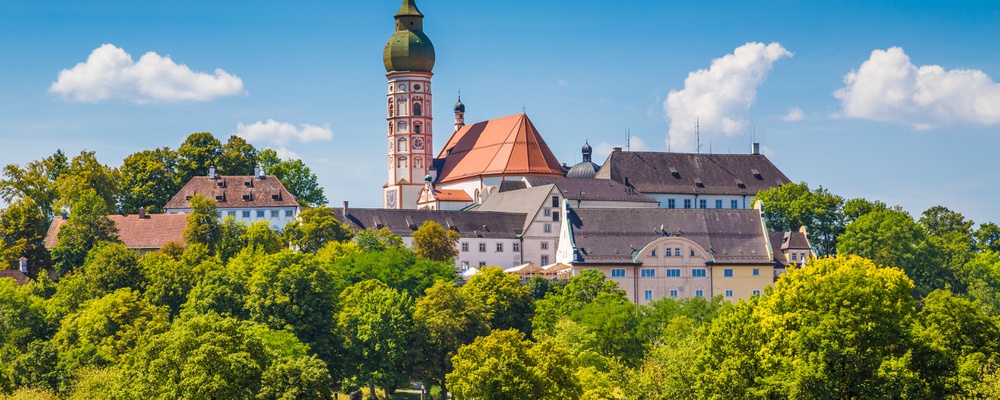 Andechs Abbey (Kloster Andechs) is a Benedictine priory close to Munich, easily reachable by train and a short hike or bus ride. A place of pilgrimage on a hill east of the Ammersee, the Abbey is famous for its Baroque church and its brewery, Klosterbrauerei Andechs, whose income helps fund the monks' mission of help. You can enjoy a beer and something to eat in the abbey's biergarten.