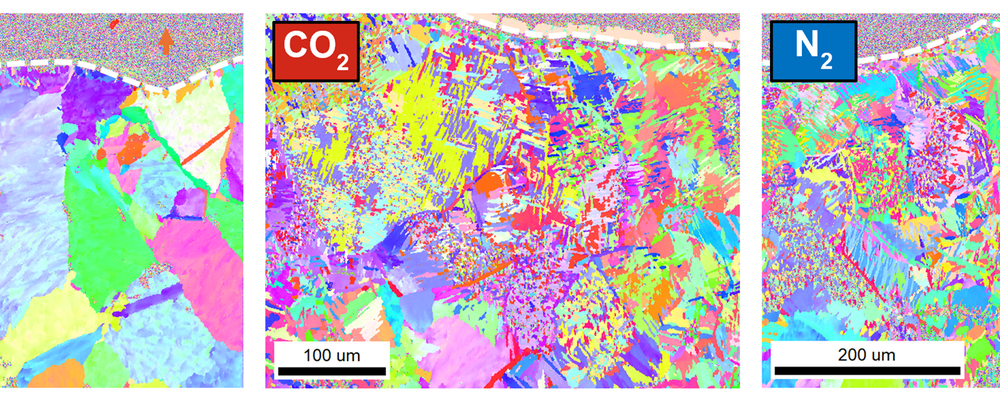 Metal-based additive manufacturing processes are conducted in inert atmospheres (argon, helium) to protect materials from undesired oxidation as well as to guarantee process safety. In this project, the inert process atmosphere is replaced by atmospheres such as carbon dioxide and nitrogen, that are more reactive, to absorb part of the process gases during printing. Adding reactive alloying elements, such as titanium, enables a reaction of the absorbed gases with the material to manufacture an in-situ nano-particle reinforced (Ti-oxide and -nitride) material. The dependence of the material-gas-interaction during the build job on the material composition, process parameters and melt-pool size and lifetime is investigated first. Then the microstructure and properties of the in-situ manufactured metal-matrix-composites is investigated. Thus, the mandatory atmosphere for process safety can be used to modify material properties locally in the parts during the build job.
