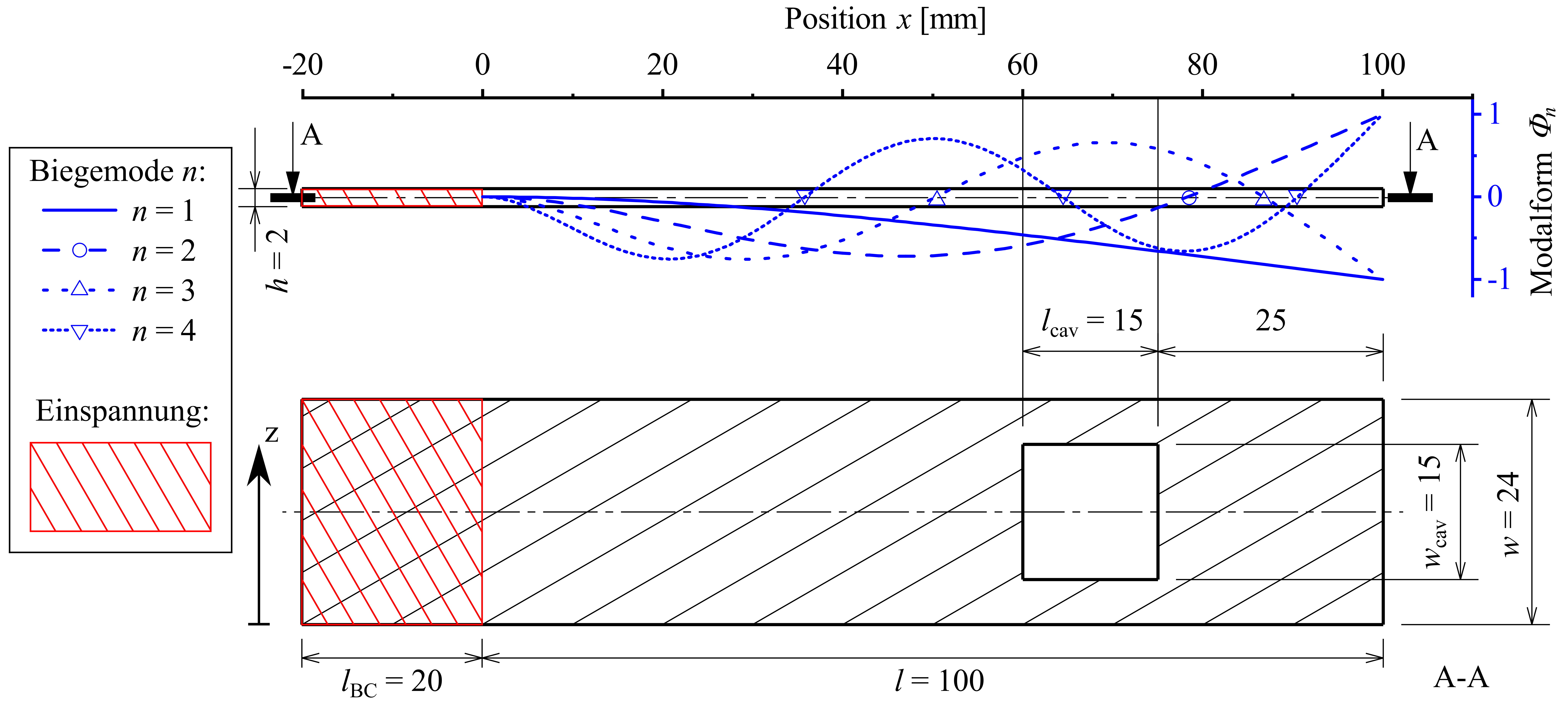 Two types of specimens were designed. The two "solid" specimens are completely fused and serve as the basis for the modal parameters. The three "cavity" specimens have the same external geometry as the solid specimens and differ only in having an internal cavity whose position was chosen so that it does not overlap with a nodal point in the first three bending modes. However, a nodal point of the fourth bending mode and the cavity coincide. The dimensions of the specimens and the first four bending modes can be seen in Fig. 2.