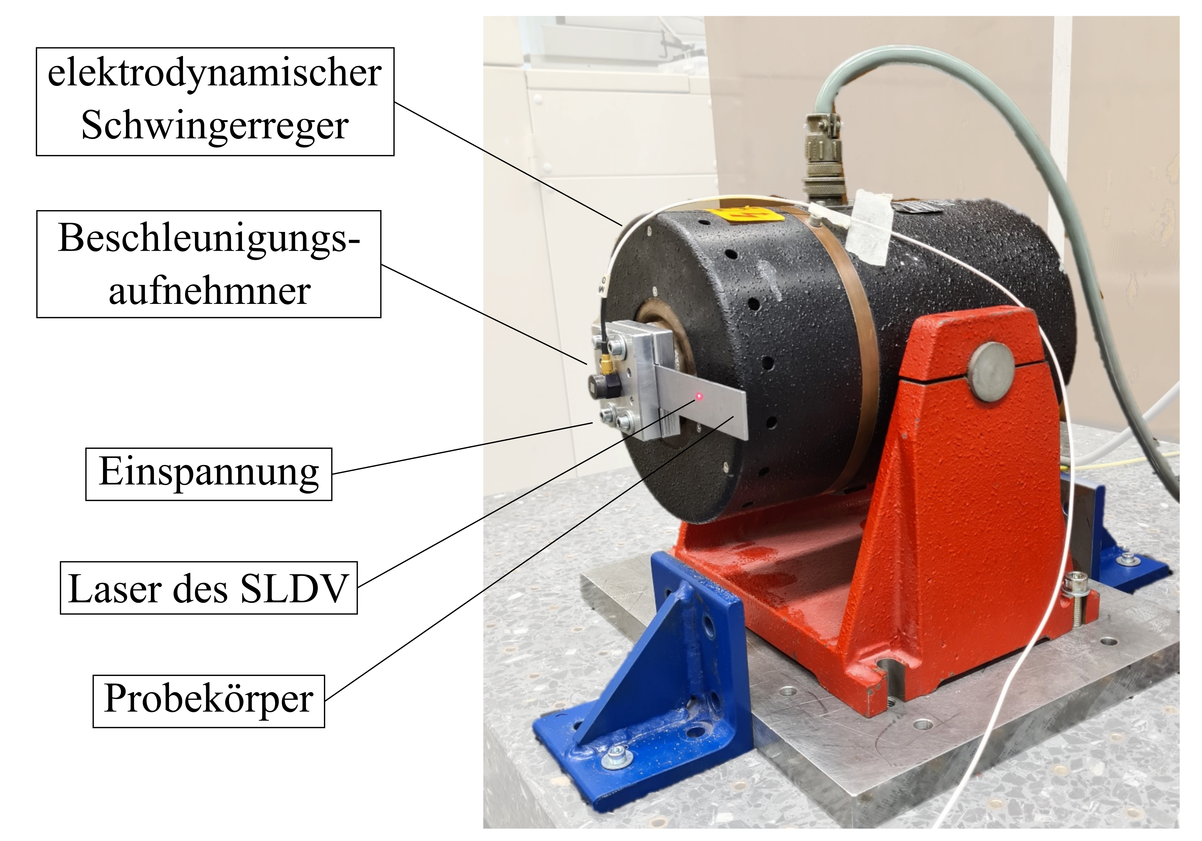 The specimens are successively clamped in an electrodynamic shaker to analyze their modal parameters. The system excitation is measured using an accelerometer at the clamp and the system response is measured using scanning laser Doppler vibrometry (SLDV), see Fig. 3. The excitation acceleration is kept constant over all frequencies within a measurement to allow better comparability between modes. After a series of measurements, it is then increased from 100 mm/s2, 200 mm/s2, 400 mm/s2 to 800 mm/s2 per frequency range to determine the nonlinear attenuation properties of particle attenuation mentioned earlier. The distribution of the particles in the cavity before and after the modal analysis is studied by computed tomography (CT).