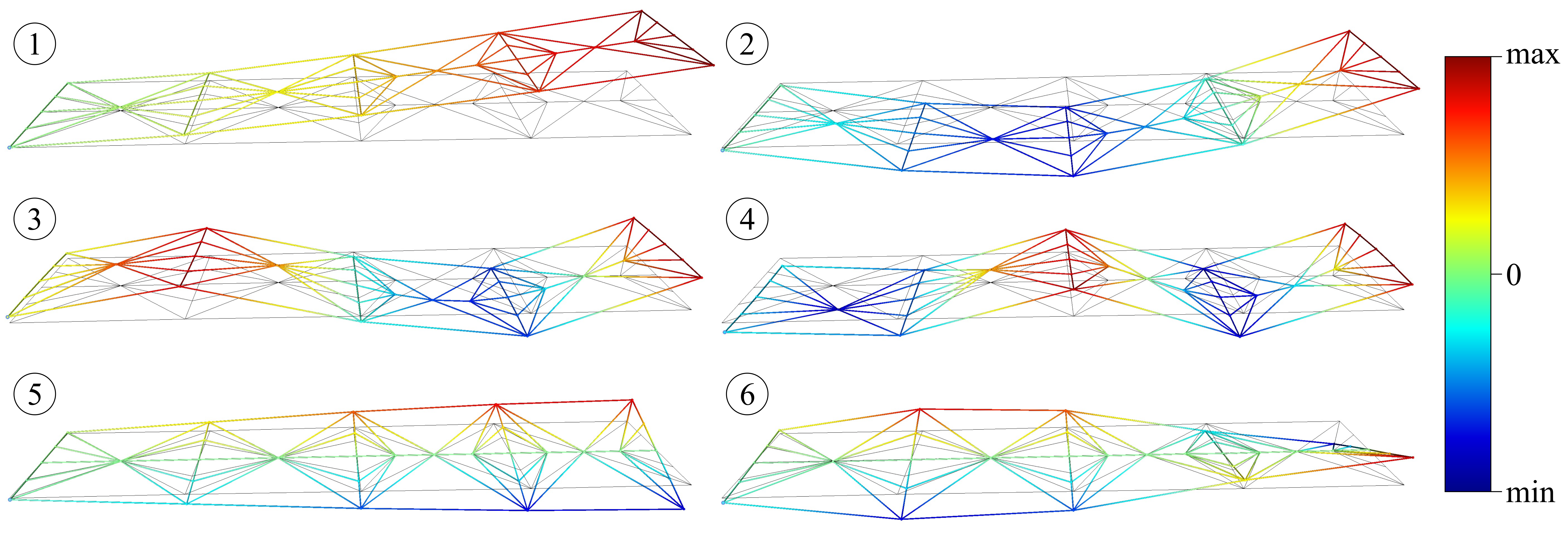With this experimental setup, the first four bending modes and the first two torsional modes are excited. The corresponding mode shapes can be seen in Fig. 4. The data of the first bending mode are not considered because large deflections lead to parasitic friction in the restraint, which affects the component damping [13]. The comparison of damping as loss factors of all specimens for all considered bending modes can be seen in Fig. 5. The bending modes show little to no damping effect for the smaller excitation amplitudes. However, for higher excitation amplitudes, the damping effect increases sharply. A positive damping effect can be seen for all bending modes, but most clearly for the third bending mode. The damping of the torsional modes was also analyzed, but no significant damping effect was measured.