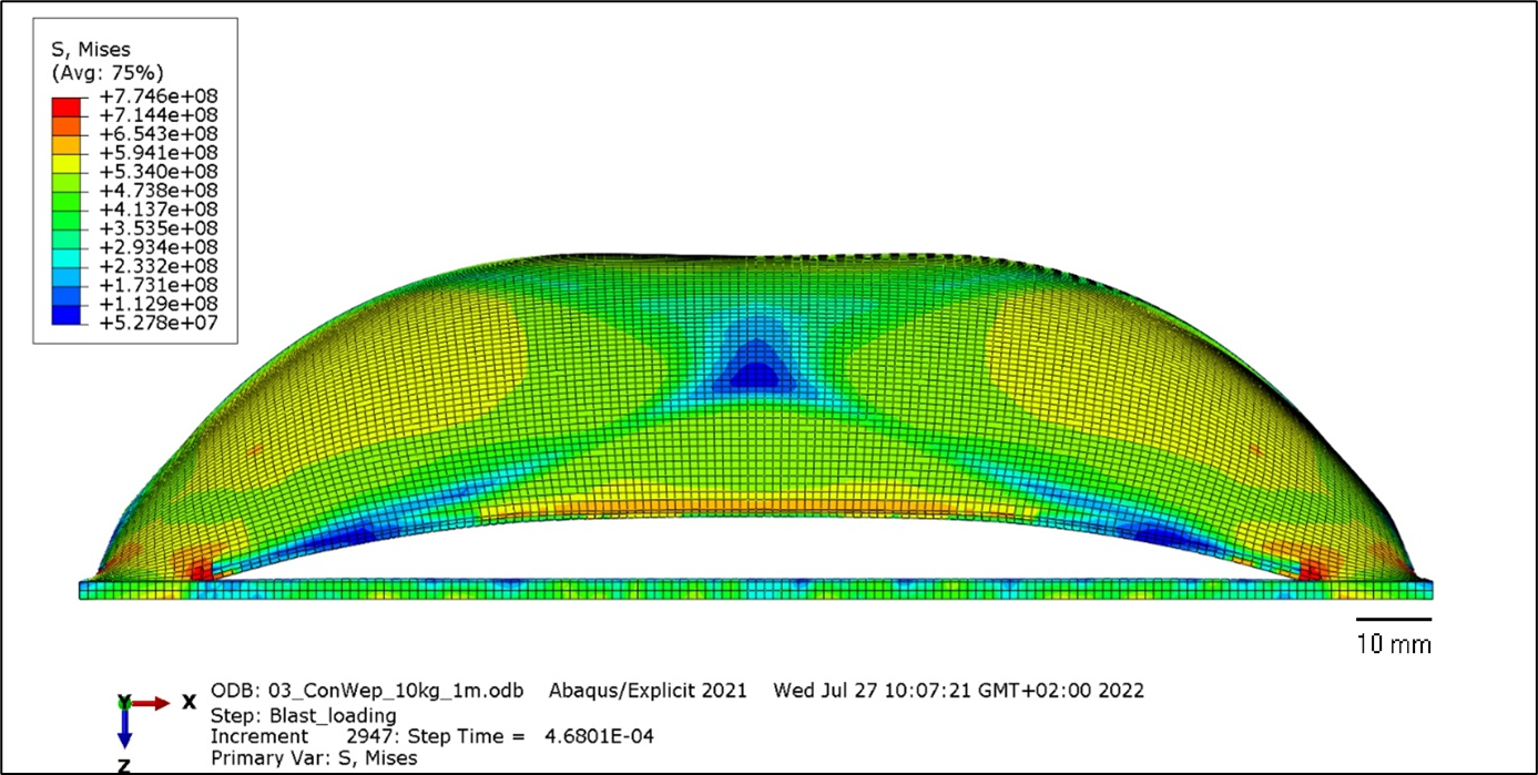 • Weiterentwicklung der numerischen Berechnungsmodelle werden für eine bessere Vorhersage der zu erwartenden Schäden überarbeitet. Ziel ist, mit einem geeigneten Modell den Blastvorgang sowie die strukturellen Schäden im Rahmen der numerischen Näherungen für unterschiedliche Werkstoffkombinationen und Laminataufbauten möglichst präzise vorherzusagen