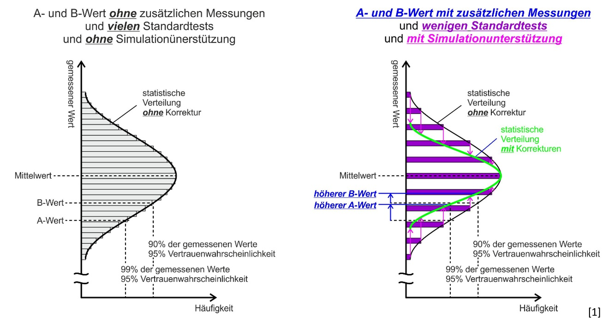 Faserverbundwerkstoffe und insbesondere Kohlenstofffaserkunststoffe (CFK) werden in vielen Produkten branchenübergreifend eingesetzt um Leichtbau zu betreiben. Aufgrund unterschiedlicher Einflussfaktoren zeigen sich hier bei der Ermittlung von Materialkennwerten, die zur Auslegung benötigt werden, relativ hohe Streuungen. Diese Streuungen führen zu vergleichsweisen erhöhten Abschlägen bei den zur Auslegung herangezogenen abgeminderten Festigkeitskennwerten (A- und B-Werte, siehe Abb.1)