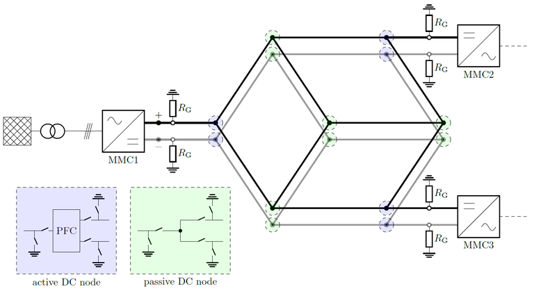 In order to obtain universally transferable results regarding controllability and protection, all investigations are carried out on a generic, meshed example grid (Fig. 1). The proposed grid structure consists of three key components: 1. MMC with full-bridge functionality for coupling the DC network with AC networks, 2. passive nodes with disconnectors and grounding switches for each connected line, 3. active nodes containing power-flow controllers (PFC) in addition to the components mentioned above. For complete current control in the three meshes of the grid, three active nodes with PFC are required, which in this example are located next to the MMC.