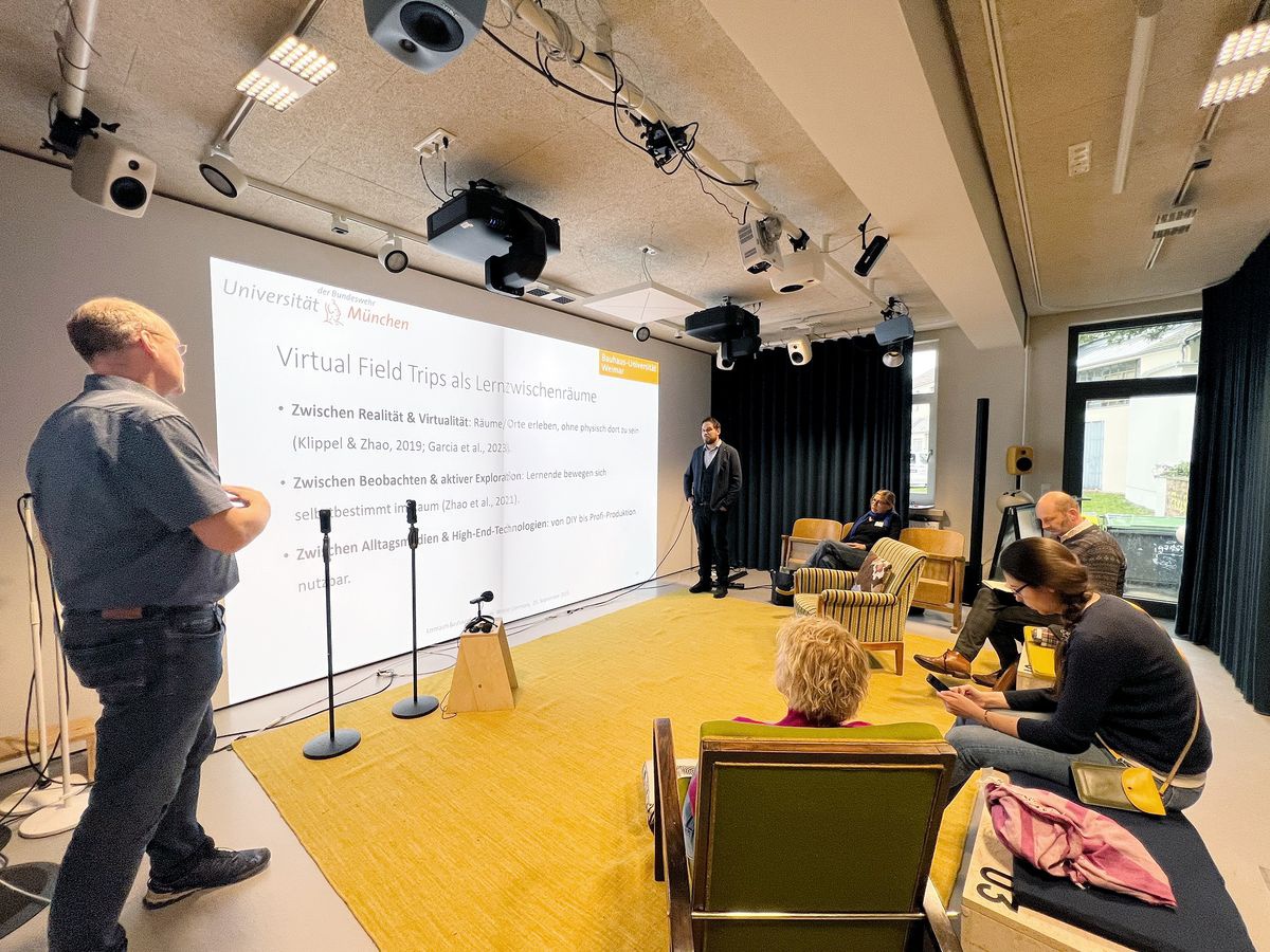 Im Rahmen des Symposiums spacing – Lernen zwischen Räumen an der Bauhaus-Universität Weimar stellten Dr. Volker Eisenlauer (Universität der Bundeswehr München), Prof. Dr.-Ing. Heinrich Söbke und Florian Wehking am 25. September 2025 im Workshop „Lernen in Zwischenräumen: Virtual Field Trips (VFTs)“ aktuelle Entwicklungen rund um 360°-Lernräume vor.