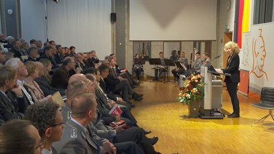 Die Präsidentin der Universität, Prof. Merith Niehuss, begrüßte herzlich alle Gäste und ging dann in ihrer Festrede auf Lehre, Forschung und die Bautätigkeit an der Universität im letzten Jahr und in der nahen Zukunft ein. „Die Lehre, die Auswahl und Zusammensetzung der Fächer, dient, wie an allen Universitäten und Hochschulen, in erster Linie den Studierenden“, betonte Niehuss. Die Bundeswehr brauche in hohem Maße Spezialisten in allen technischen Bereichen und in der IT, diese bilde die Universität der Bundeswehr München aus für die Jahre, die die studierten Soldatinnen und Soldaten im Dienst der Bundeswehr stehen. Aber auch für die Zeit danach sollen die Studierenden hier einen qualifizierten akademischen Abschluss erwerben. Auch für die vielfältigen nicht-technischen Aufgaben benötigt die Bundeswehr den akademisch ausgebildeten Offizier. Insgesamt braucht sie die Führungspersönlichkeiten, die im universitären Bereich oder im Bereich der Hochschule für angewandte Wissenschaften (HAW) studieren. Einen Ausblick gab Prof. Niehuss auf die geplanten neuen Studiengänge, um die Attraktivität des Studienangebots weiter zu steigern. So werden im HAW-Bereich an der Fakultät für Betriebswirtschaft der Studiengang Human Resource Management und im universitären Bereich mit sechs neuen Professuren die Fachrichtung Kulturwissenschaft aufgebaut, die regional den erweiterten Mittelmeerraum umfasst, sprachlich Französisch und Arabisch lehren wird und fachlich von der Islamwissenschaft über Politik, Soziologie und Geschichte bis zum juristischen Umgang mit Kulturgütern reichen wird.