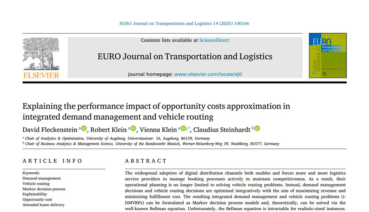 Das in Kollaboration zwischen Prof. Steinhardt und einem Autorenkreis der Universität Augsburg verfasste Paper "Explaining the performance impact of opportunity costs approximation in integrated demand management and vehicle routing" ist im EURO Journal on Transportation and Logistics erschienen. Die Arbeit entwickelt einen systematischen Erklärungsansatz für die Frage, in wieweit Ungenauigkeiten bei der Approximation von Opportunitätskosten in integrierten Nachfrage- und Tourenplanungsproblemen (i-DMVRPs) die operative Steuerung derartiger Systeme beeinflussen. Der Ansatz liefert dadurch auch wertvolle Erkenntnisse für die Auswahl und Entwicklung geeigneter Lösungsalgorithmen.