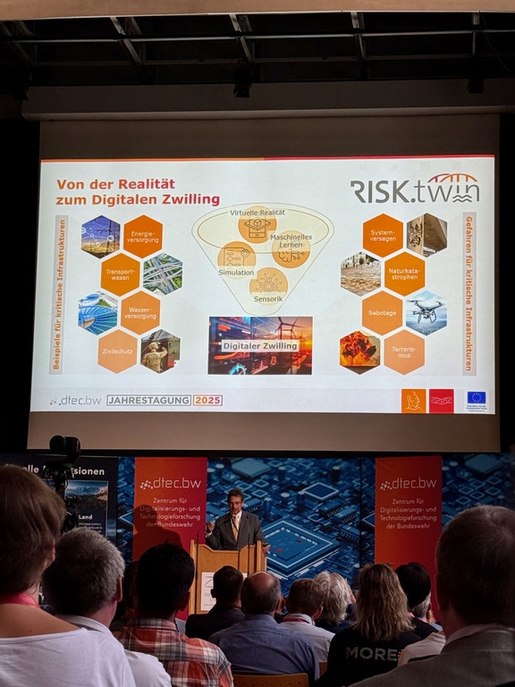 Vom 1. bis 3. September 2025 war das RISK.twin-Team bei der diesjährigen dtec.bw-Jahrestagung an der Helmut-Schmidt-Universität in Hamburg vertreten. In der begleitenden Fachausstellung konnten wir unser Projekt und dessen Fortschritte zahlreichen Besucherinnen und Besuchern aus Bundeswehr, Wissenschaft und Industrie vorstellen.