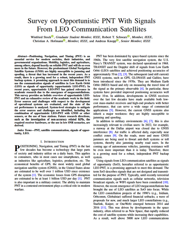 Best Publication Award 2025 December 11, 2025. Our institute awarded the “Best Publication 2025 Award” to Winfried Stock. The winning publication entitled “Survey on opportunistic PNT with signals from LEO communication satellites” has been authored by Winfried Stock, Robert T. Schwarz, Christian A. Hofmann and Andreas Knopp.