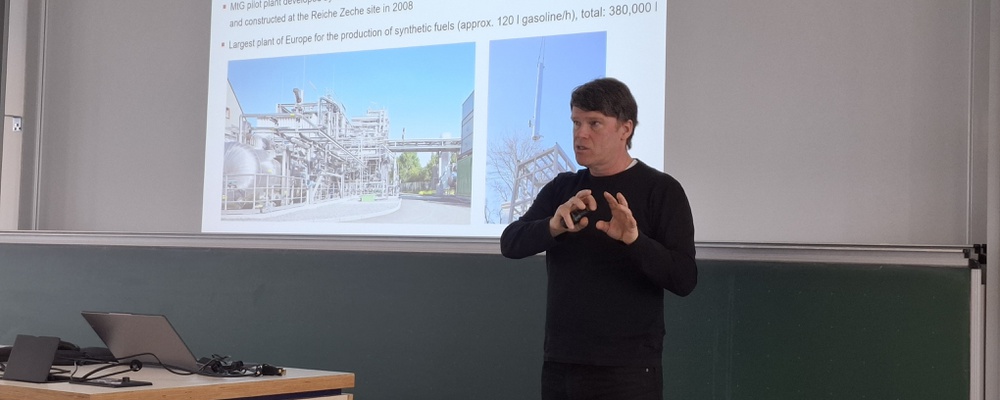 Er hielt einen Vortrag im Rahmen des Thermodynamik-Seminars mit erweiterter Hörerschaft aus dem FZ-MORE zum Thema „Synthesewege von nachhaltigem Benzin, Kerosin und Diesel aus CO₂“. Hierin gab er einen Überblick über aktuelle Forschungsansätze zur Herstellung synthetischer Kraftstoffe für die Schließung der Kohlenstoffkreisläufe. Insbesondere in der Luftfahrt stellen nachhaltige, synthetische Kraftstoffe (Sustainable Aviation Fuel, SAF) eine praktikable Möglichkeit dar fossiles Kerosin zu ersetzen.