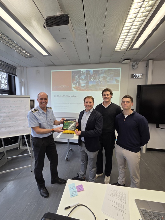 Kürzlich durfte unser Lehrstuhl für Wirtschaftsinformatik, insbesondere Digital Process Management, den Chief Information Security Officer der Bundeswehr, Guido Schulte, sowie weitere Informationssicherheitsbeauftragte der Bundeswehr im Rahmen einer Weiterbildungsfahrt an der Universität der Bundeswehr München begrüßen. Bei einem LEGO-LeSS-Workshop übten die Teilnehmenden die Anwendung skalierter agiler Methoden. Dabei wurde mittels agiler Prinzipien und der Herausforderung in kurzen Zyklen mit Lego eine resiliente Smart City von hoher Lebensqualität zu bauen, die Zusammenarbeit in agilen Projekten nach dem LeSS-Framework erprobt und dabei typische Rollen, Artefakte und Ereignisse praktisch umgesetzt. Der Workshop kombinierte methodische Grundlagen mit einem interaktiven, spielerischen Format und bot den Teilnehmenden die Möglichkeit, Zusammenhänge zwischen agiler Projektarbeit und Informationssicherheit konkret zu gestalten und zu diskutieren.